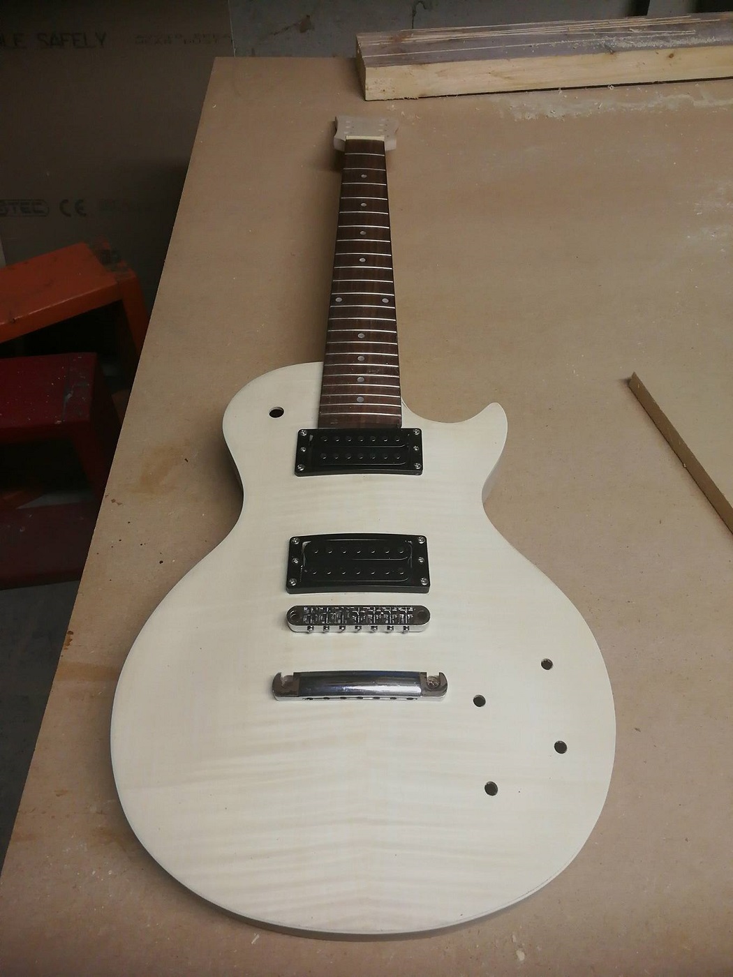 Next up is the LPA-7 kit. So far, I've routed out the channels for the pickups as I'll be putting in Entwistle Dark Star 7's (which have a 88mm gap between pickup screws instead of the 78 as default on this kit). I'm replacing all the hardware with blacket plastic and metal. Any advice on where to find a suitable black 7 string nut would be greatly appreciated though =) Will be finishing this guitar in the Onyx gloss with silver highlights, stain, also from wudtone.com. I'll leave the white binding and I'm hoping that the darker would on the body and the lighter wood on the veneer/neck will create a sort of dual-tone, whilst still only using the one colour of stain.