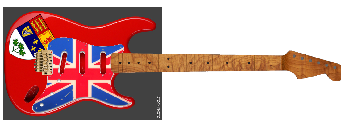 With my original plan foiled, I eventually got some inspiration to do a strat based on the old unofficial Canadian flag, the Red Ensign. I played around with some ideas and settled on a red body with Canada coat of arms design, Union Jack pickguard, gold hardware and (of course) a maple neck. This Frankenstein image was pretty much my concept.