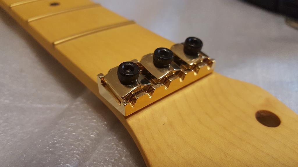The gold Floyd Rose trem I bought came with the nut, so I was ready to go when the neck arrived. It was a top mount nut so I pre-drilled the mounting holes and fastened it on.