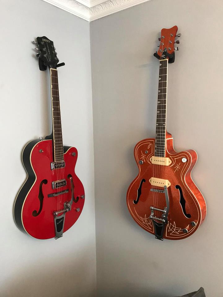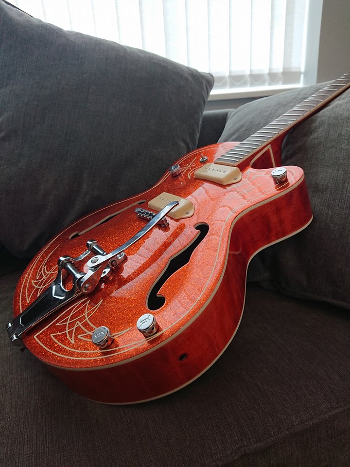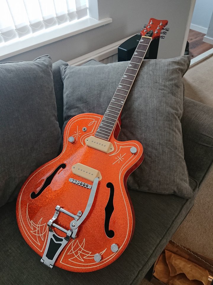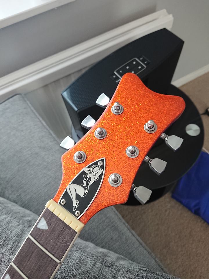 hi there as some of you would have seen i had problems with my gr1sf project, basically my original stained look was jeopardized by sanding through the veneer by mistake! racked my brains on how to save it and this is what i came up with, sides neck and back in crimson guitars orange stain and front of body and peghead metal flake atomic orange happy is an understatement, all metal flake, staining, pinstriping and so on all done by me, other than the p90 pickups and the truss rod cover and gretsch knobs its out the box stock. the nut will need replacing as its miles to high and i'm yet to wire in the pickups and input jack but thought id share some photos looking forward to your opinions thanks