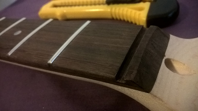 Whittled away the fretboard corners with a Stanley Knife (crude but effective) and pulled the plastic nut.