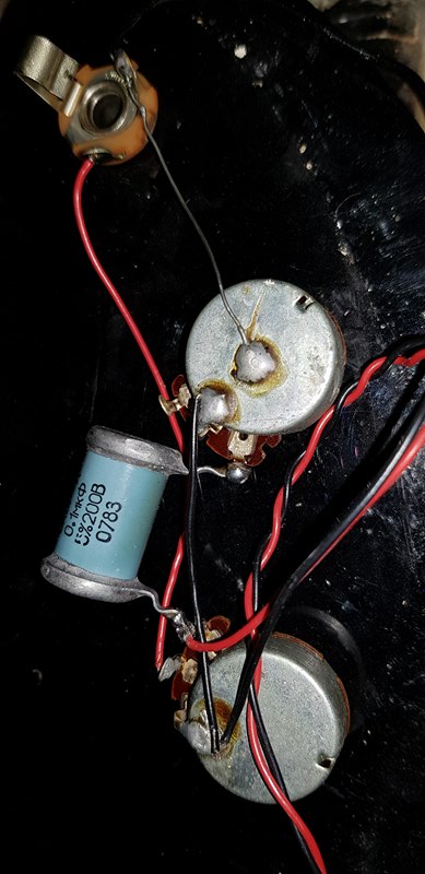 Well it's a 0.1uF capacitor, but I'm not sure exactly what type it is. It looks a bit Russian to me. It's not going to matter massively what type it is for you, as you keep the tone control fully up. But if you ever used it, the large capacitance value means that it's going to go muddy very quickly. As I know you like bright tones, I'd keep it safe somewhere, but replace it with a smaller value capacitor, maybe 0.033uF or 0.022uF. The smaller the value, the brighter the tone.