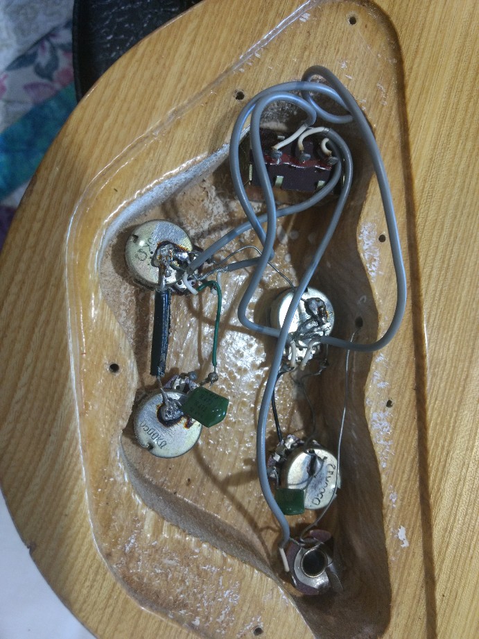 Note that the tone pots are inverse-acting pots, so if you end up replacing them, I'd use standard pots and connect up the centre and the other outer tag to the one used. Note that the tone pot for the bridge pickup is completely missing the unused outer tag and the paxolin board it was attached to is broken (probably removed so that it didn't contact the ground wire linking the volume and tone pots.