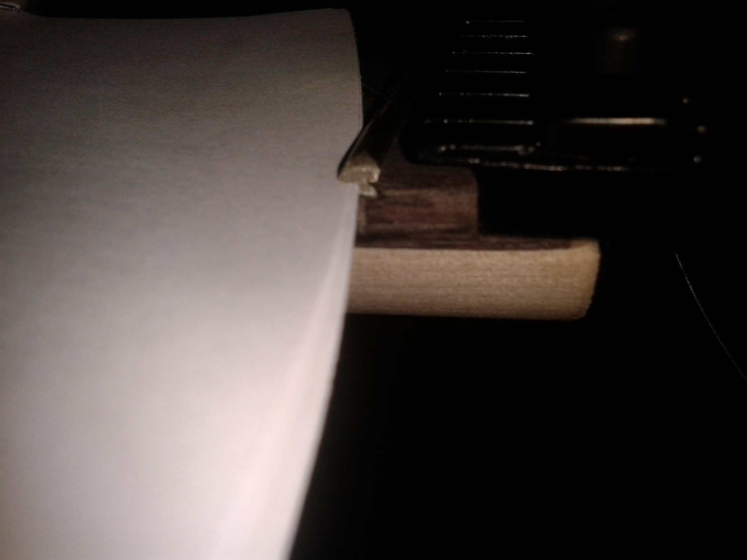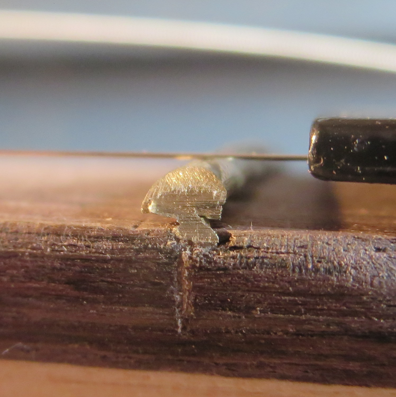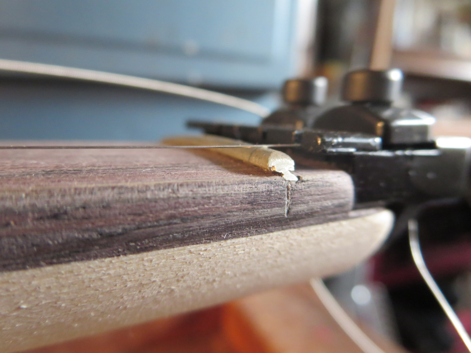 The zero or null fret of my headless KH-1 neck does not seem to be inserted properly in the neck. Please look at the picture. I can fit five sheets of paper (from the string envelopes) between the fret and the fretboard. The fret seems to be inserted at an angle and is hovering above the fretboard.