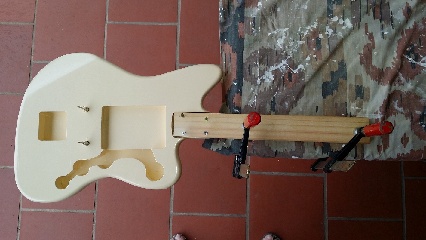 Firstly an update: I have masked & stained the neck with a maple stain. Not the best photo (bit dark), but I have a few sands & coats to go. I have also timber primed the body and have applied the first spray coat of "aged cream". That photo to follow later, but I have noticed that my brush stokes from the wood primer are showing through.