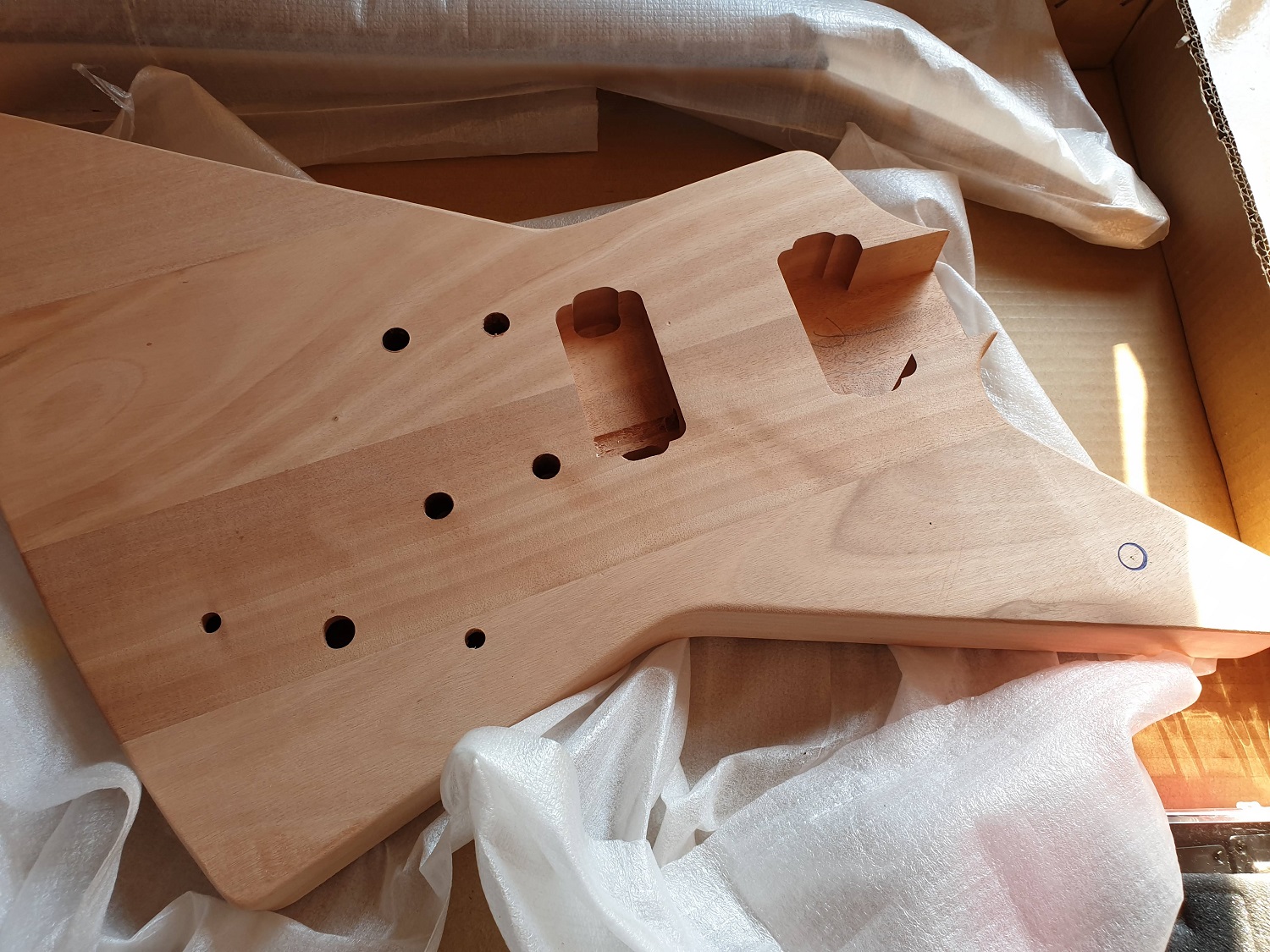 And so, a few weeks ago the PitBull EXM-1 kit arrived. Whilst waiting for the kit to arrive I had decided a few modifications were in order. Move the three-way switch to the traditional Explorer position, a white pickguard and two volume pots and a master tone pot. I have also purchased Seymour Duncan Seth Lover pickups to replace those included.