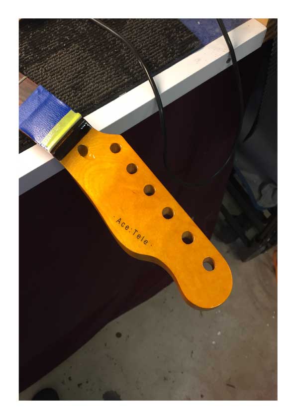 The neck has 2 coats of amber. The headstock pic is under about 3 coats of clear nitro. It's a simple decal - Ace is my amp 'name' so I kept the theme running here.