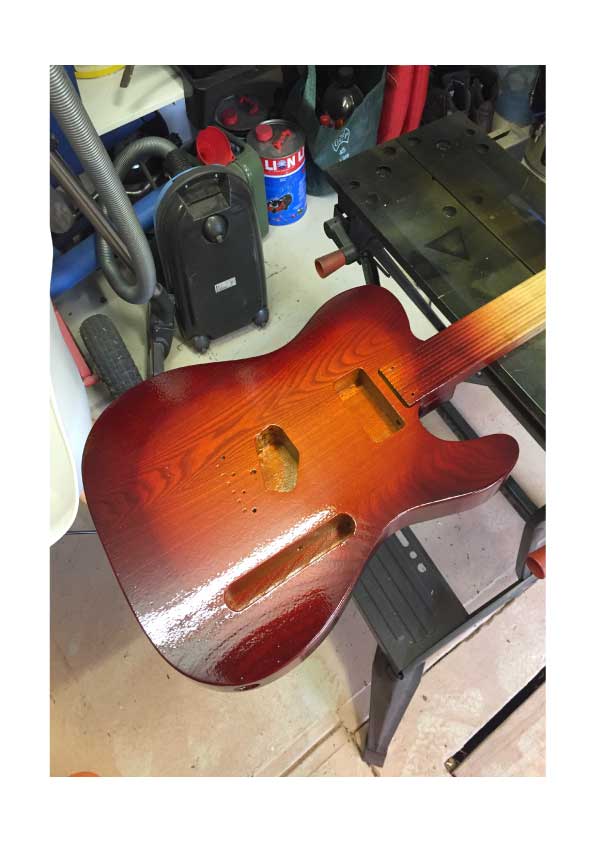 I've made some progress on this build - I've gone with a cherry burst. The pick guard is pearloid white which contrasts well with the colours. I must say that I really like using the Nitro finishes - they are so forgiving to spray. Provided you use the correct PPE and ventilate the area it is all fine. I used Dartford Amber and Aged Cherry. 3 coats of Sanding Sealer first then the coloured finish.