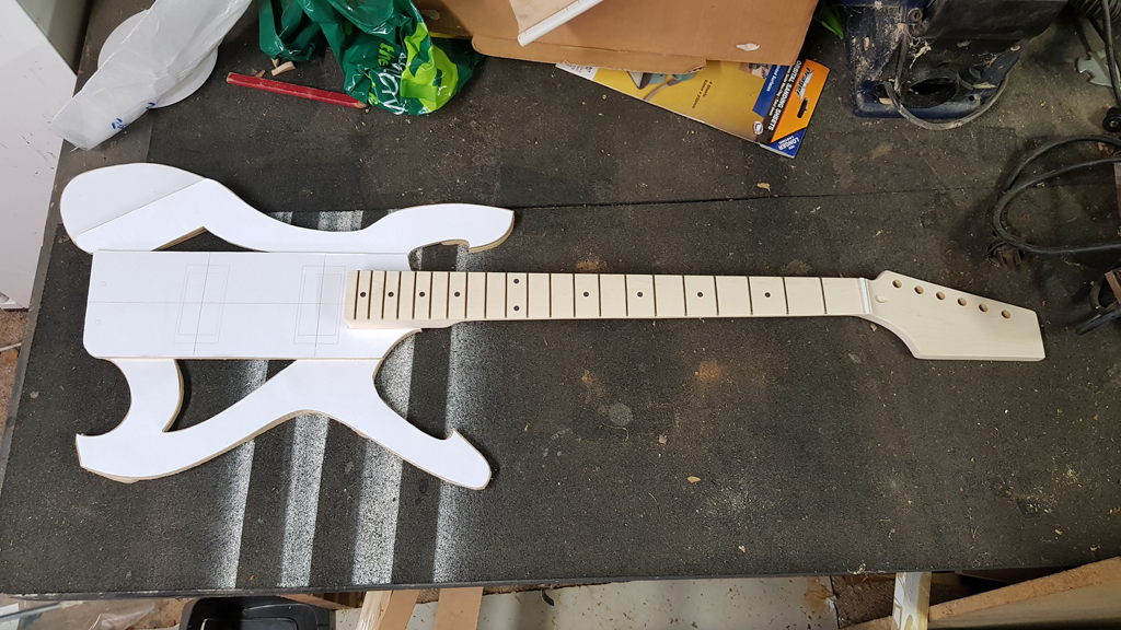 Ergonomically speaking, the Andreas Shark is the biggest influence, though I won't have quite as much contouring, or the super slick aluminium fretboard. Then there's the Iceman horn, and a similar top horn that I'm hoping will prevent neck dive, given the lighy body/long neck. The rest is "Rick-Toone-on-a-budget". If this works out, I might make a future variant with a standard neck, carbon fibre sheets and some nice Queensland Maple I have sitting around.