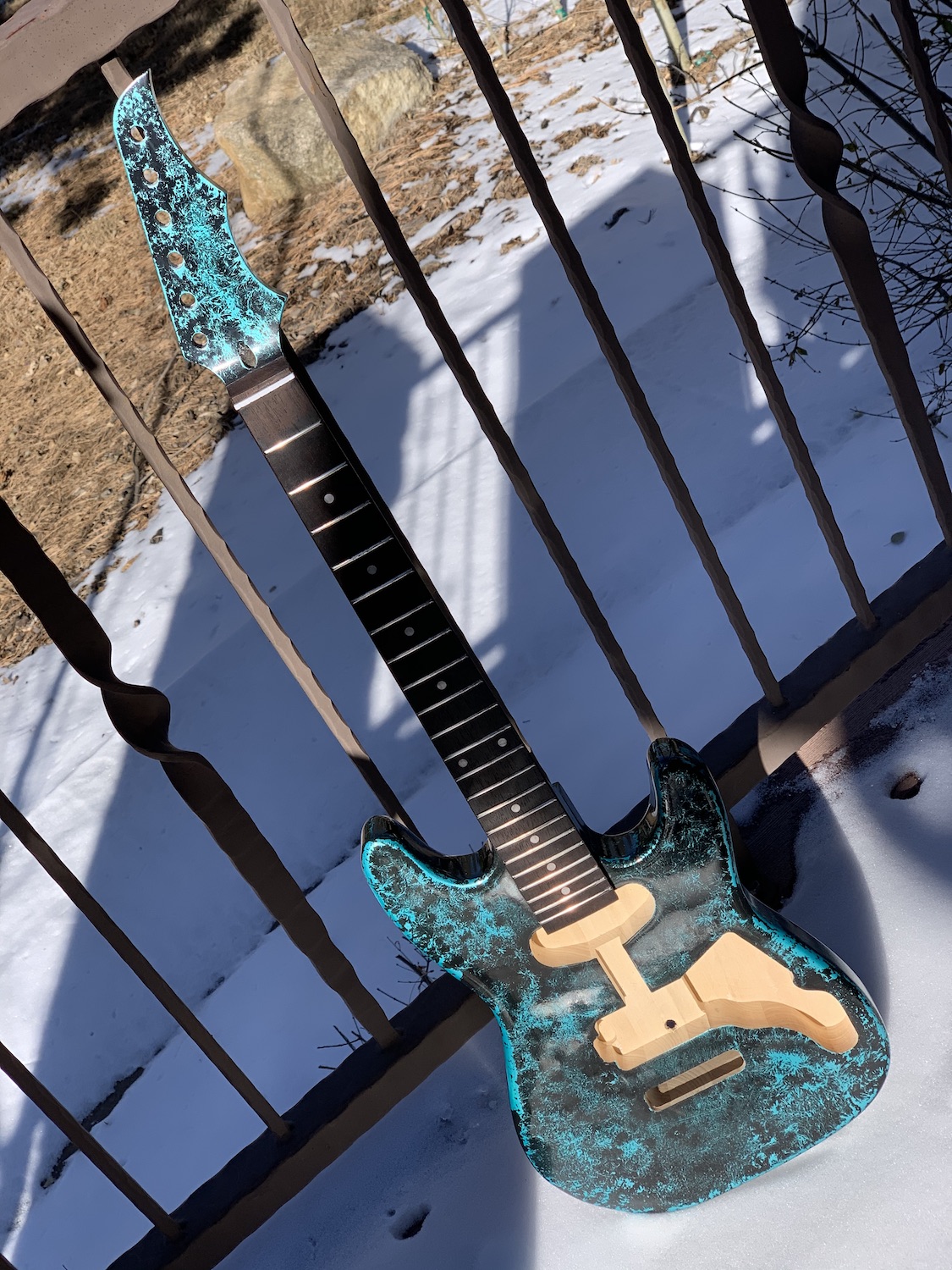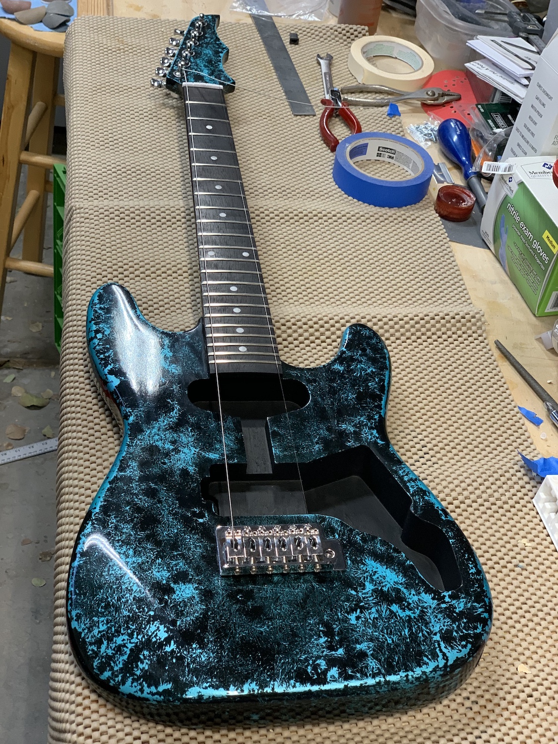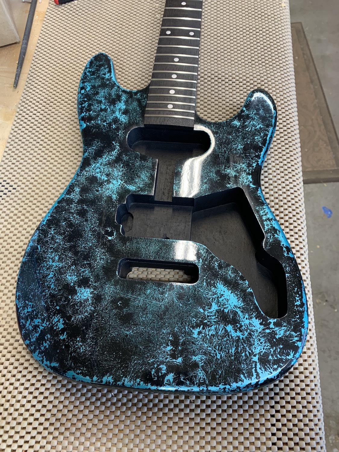 OK a little late to the party, but here's the first progress shots of an ST-1JR 3/4 I'm putting together for my son. This is my second build, the first being a 335 kit from somewhere else. The requested theme was "Ice Wing", which is apparently some sort of dragon made out of ice from a book he's reading. The head I carved out on a bandsaw to resemble a dragon tail, and then tried to put a paint job on it resembling ice crystals. The last piece will be to put an engraving of a dragon into the pick guard.