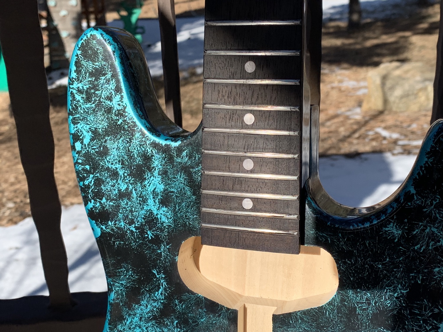 I decided I wanted something darker than the rosewood or "blackwood 2" or whatever it is for the fretboard, so I hit it with some general finishes espresso gel stain which got it to a nice dark tint that matches the paint better. Time will tell how well that wears. I still need to polish some of the stain off the frets, but it came off with just my fingernail where I made an attempt, so it shouldn't be an issue.