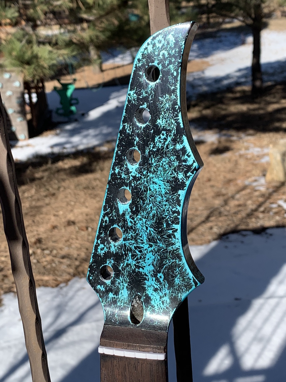 The overall effect wasn't quite as "crystal" as I was shooting for, but the customer is happy so I'm not going to start over hoping for better. I maybe could have gotten a better effect if I had purchased the $200 off the shelf crystal paint solution instead of $8 of urea fertilizer from amazon. Or maybe it was my prep work. Probably my prep work. Couple things I learned - the urea solution is not a supersaturated solution as I tried first. When I did that, the urea crystalized immediately on contact and didn't leave a crystal pattern but instead built up in a sludgy layer. I watered it down until it took a few minutes to crystalize as the water evaporated. I couldn't get it to take longer than a few minutes - probably due to the extremely low humidity here. I tried several things to get it to leave a thick layer and so leave bigger crystals, and in the end a couple squirts of dish soap worked the best, but still not great. The black paint also didn't scrub off as neatly as I was hoping - possibly/probably I should have used a rougher grit sanding of the clear coat before spraying down the urea so as to get better adhesion between the clear coat and the black. It might also have to do with the mixing of chemistries - I used acrylic for the base, acrylic for the clear coat, but my black coat was oil based - I probably should have gone back out to the store and picked up some black acrylic instead.