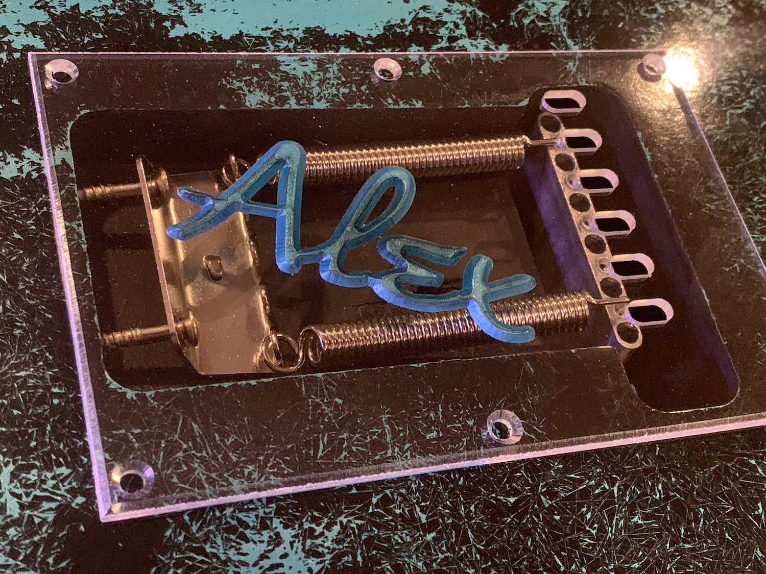The process is to V-Carve the image into the back of the acrylic with a CNC, and then paint it from the back. When the plastic is peeled off, you get this. To give it a little more texture, I dry brushed black into the carving first, and then painted the metallic blue matching the guitar over top. I haven't decided yet to go with blacking out the acrylic after painting the back (so it's a gloss black with the blue art on top), leave it clear like the photo, or go with a tint somewhere in between. I've got some automotive vinyl tint on order to try that out. If I do go with transparent or tinted, I'm going to have to completely redo all the wiring - the harness that came with it is definitely not visible grade.