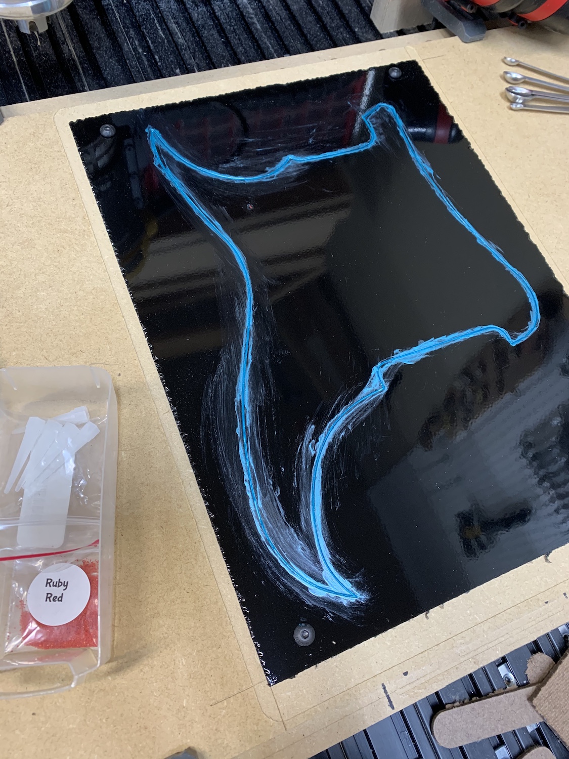 3) Make a new pick guard. The white one doesn't really match. I have some clear cast acrylic on order. I ordered from a local company so it gets here faster, and after they take my money I get a note "that's in our Houston warehouse so we'll put it on the next transfer shipment and it will get here in a week". Grrrrr... The plan is to run it through the CNC to shape, then v-carve an "Ice Wing" dragon into the underside of it. I'll paint it to match, with the paint on the underside so it doesn't all get scratched off by an over-eager 10 year old shredding some AC/DC.