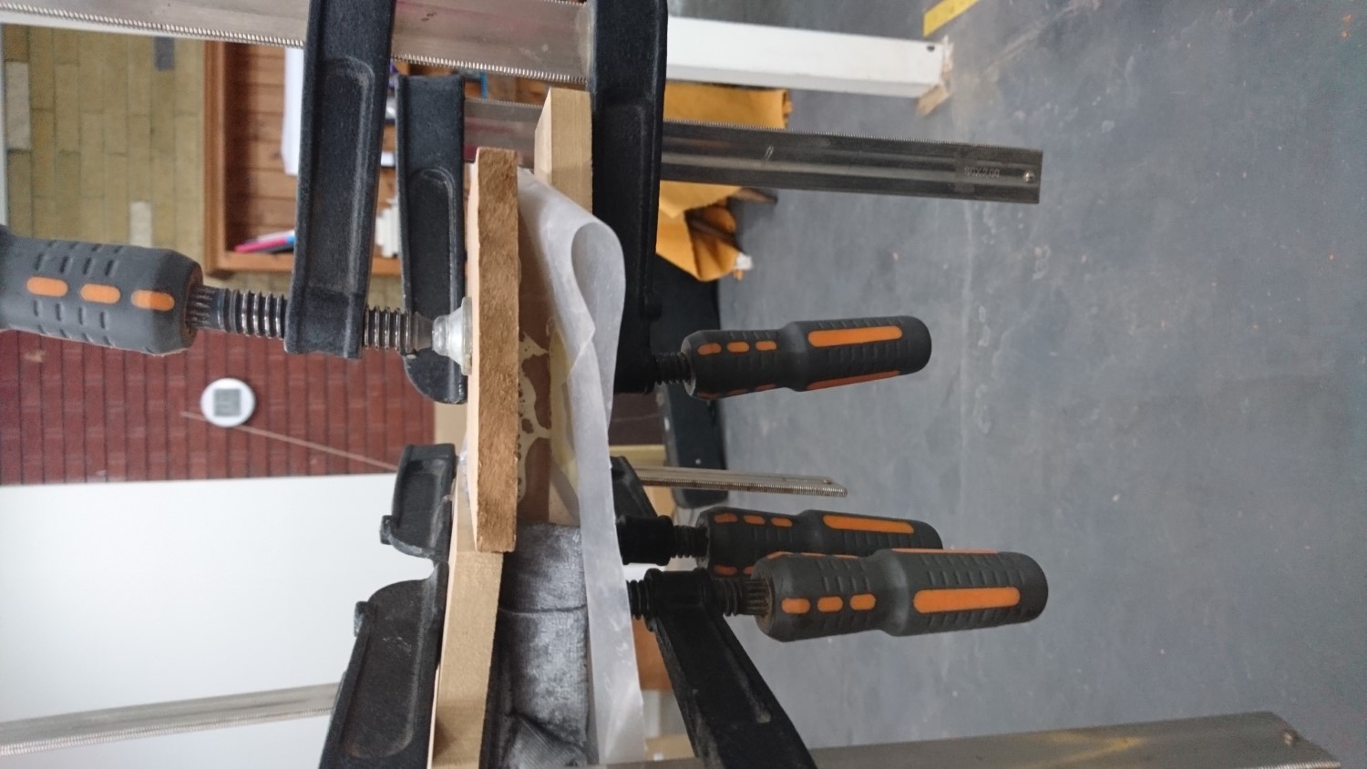 The brain-teaser we had was "how are we gonna get these veneers to sit nicely in the curves that have been sanded in?" Fortunately Matt had some little pads around, meant for guitar cases and such, which in combination with a few bits of wood did the job fairly nicely. I really do hope it does stay that way, but it seems all functional for now.