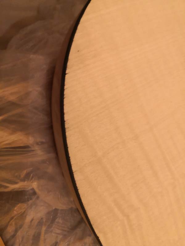 I have finally started on my kit, bought last year. The flame veneer top and mahogany back looks really good to me, so I am going for a natural finish. Can't get DingoTone in the UK, so bought some finish from Crimson Guitars. I am sure I read some advice from DingoBass about rubbing the top with 400, so that it what I did, trying to smooth out the slightly cracked bottom end. Then I looked at the current advice, which is not to touch the top! Never mind, didn't make it worse or rub through. However, I did manage to chip a bit of veneer when reaming put the holes to take upgraded pots. Have rubbed the back and sides up to 400 - do I need to do more?Click image for larger version.
