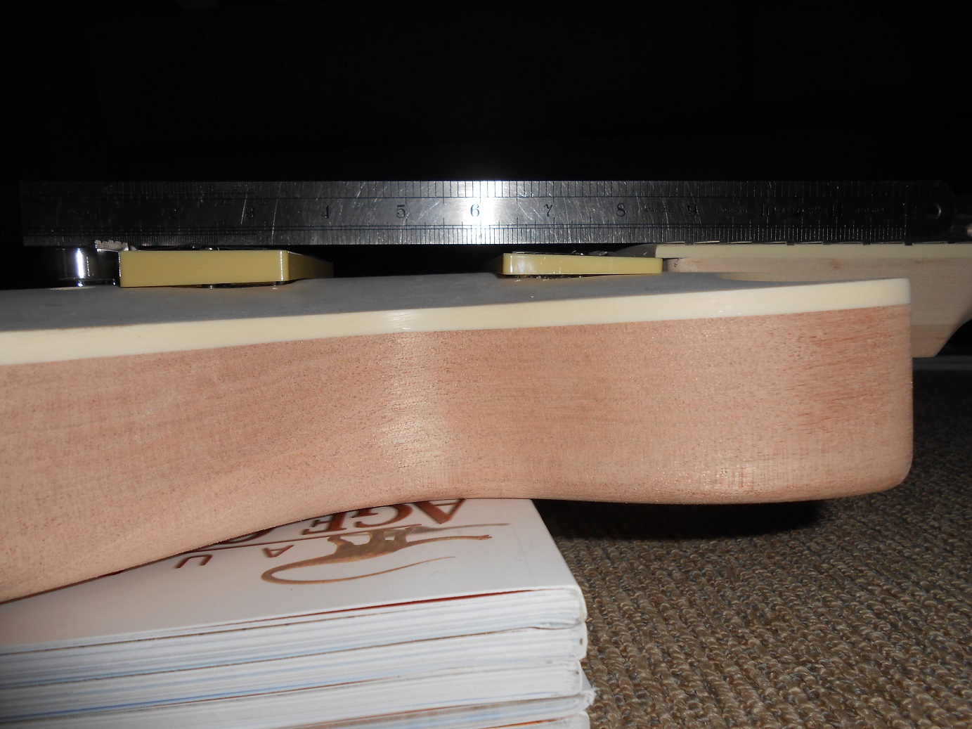 I am comparing my photo to Andy40's prizing winning photos from May guitar of the month. The white edgestrips on the fretboard and body are actually touching. Mine has a 4mm gap. The top of his fret board is almost the same as the top of the pickup.
