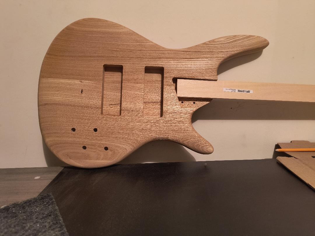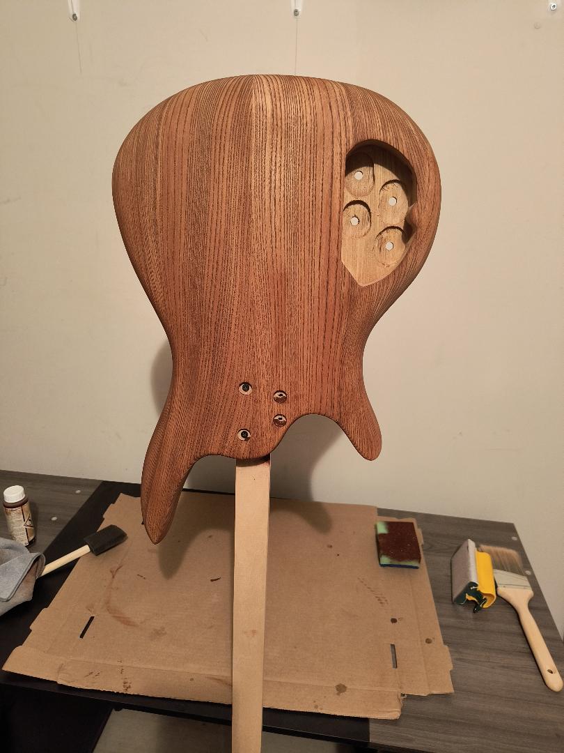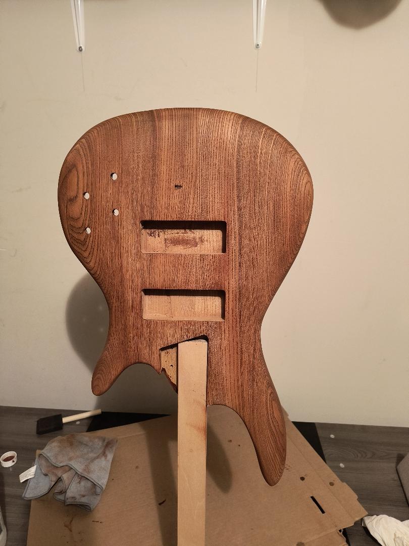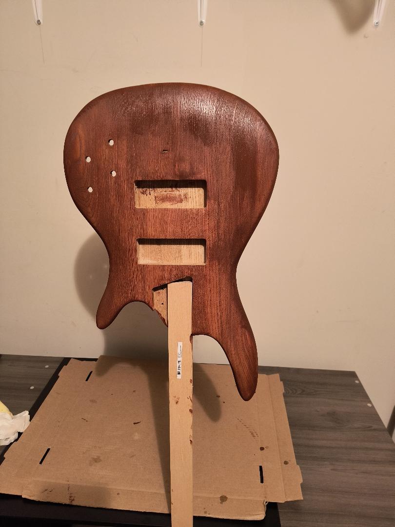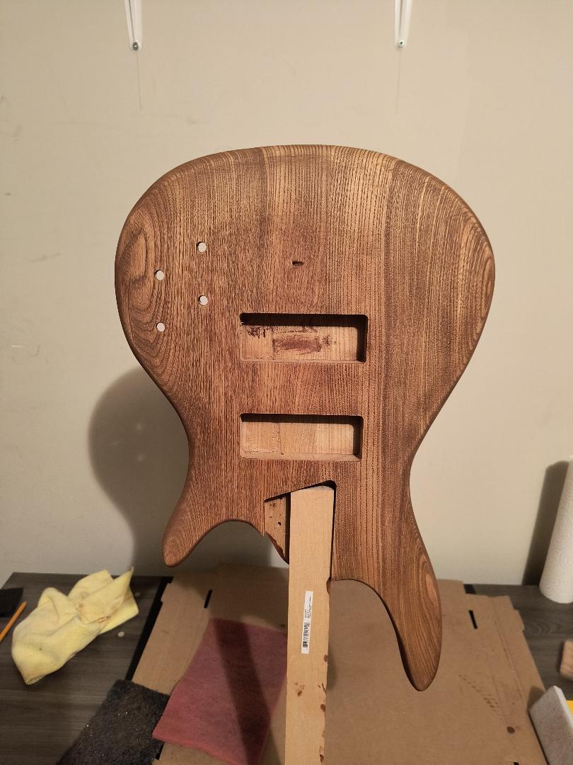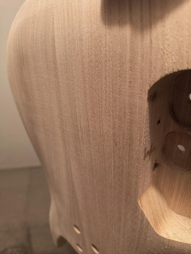 Was unsure of what level of sanding the body came with out of the box. Started with 80 grit, then 120. I later learned that the body does come pre-sanded to about 120 grit, and that there might already be a coating of wood conditioner. There were some machine marks running across the grain on the front and back, in basically the same location on each side (as can be seen in photo).