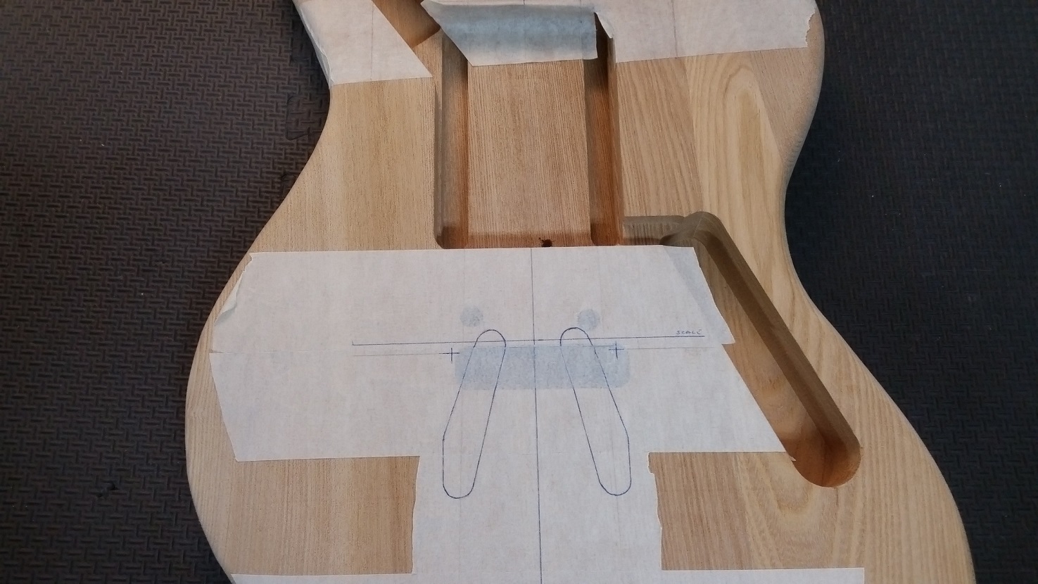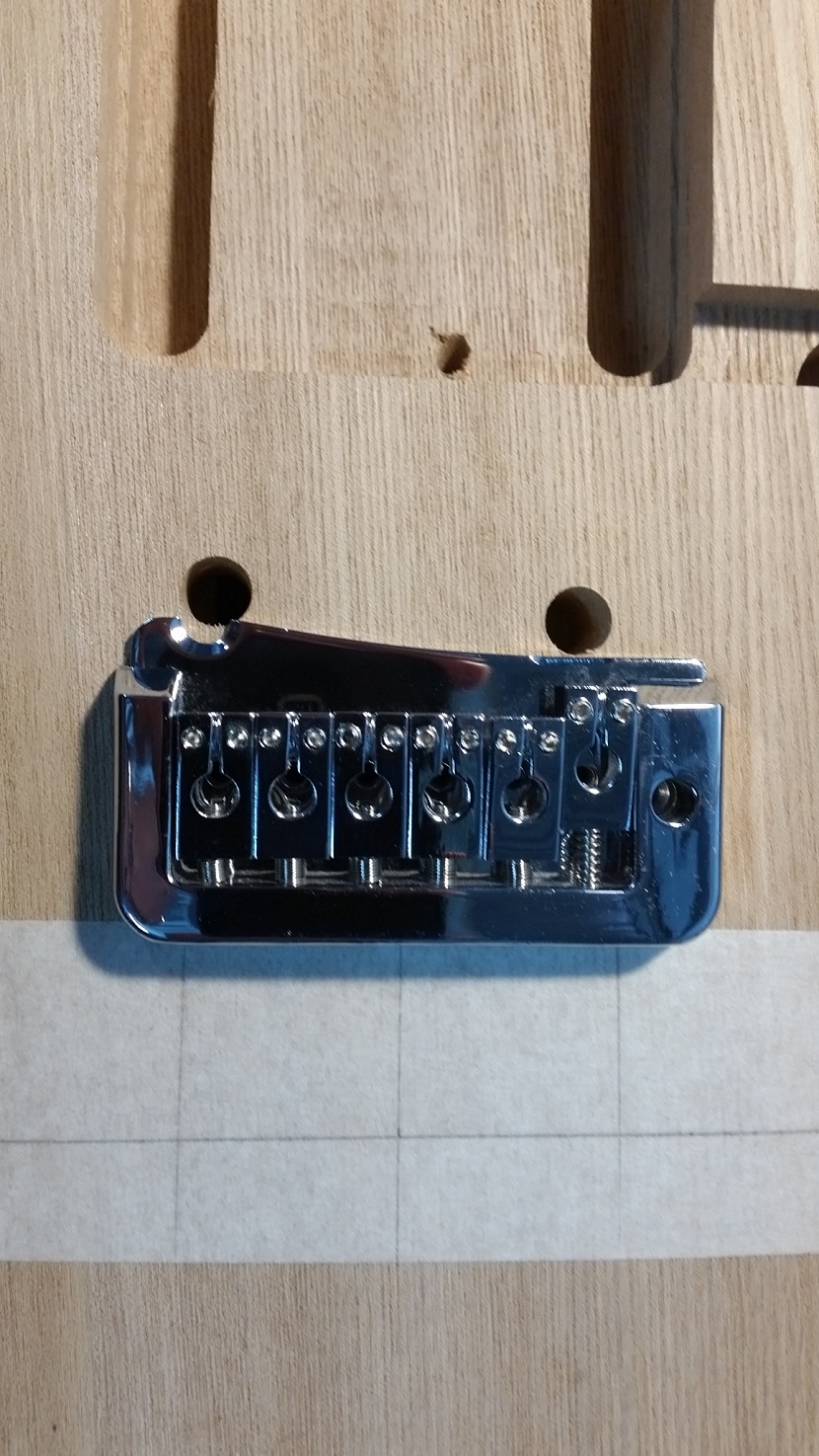 Had a problem straight out of the gate, the bridge post holes wouldn't let the bridge sit square to the centre line of the body. Let Adam know and he offered to replace the body immediately, excellent service as always. Channeled my inner Baldrick and came up with another option (cunning plan possibly). If I used a Mustang trem it would not only replace the stock bridge but also cover up the filling of the stock trem cavity (on the front at least). At the same time decided to use a Jag bridge so the saddles could be set to the same radius as the fretboard, the Mustang ones are set for 7.5" radius from memory.
