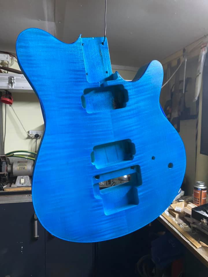 My name is Troy and I am a fulkl time musician and studio and school owner. I received a MM-1FG kit for my anniversary from my wife and today I got started on it today, after finishing the body and shaping the headstock I got to shooting my chosen colour and it turned out great.