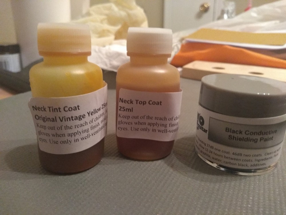 For the neck and headstock I'm going to use the original vintage yellow and top coat from Wudtone. The idea for the headstock is to use a coping saw to shape it like a reverse Firebird headstock shape. I may not have enough wood to work with though, so I'll update that idea as needed. I added the copper shielding tape too, but I think I'm going to use a shielding paint this time. I may end up swapping the white pick guard for a clear pick guard, the paint would probably end up looking cleaner. Thanks everyone!