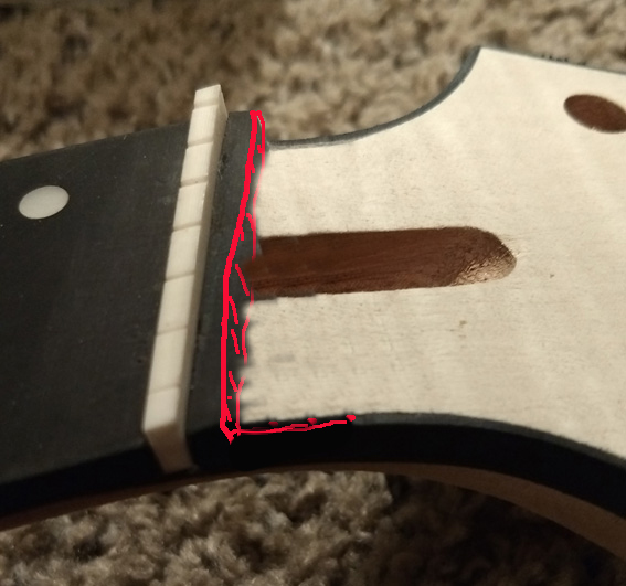 On that bit of the fretboard past the nut I'd definitely be taking a file to that to angle it down the headstock. So that there was a triangular facet with one side that ran parallel to the nut, one side that went from that parallel point at the lower side right to the headstock, and the third side heading back up to the current end of the fretboard.