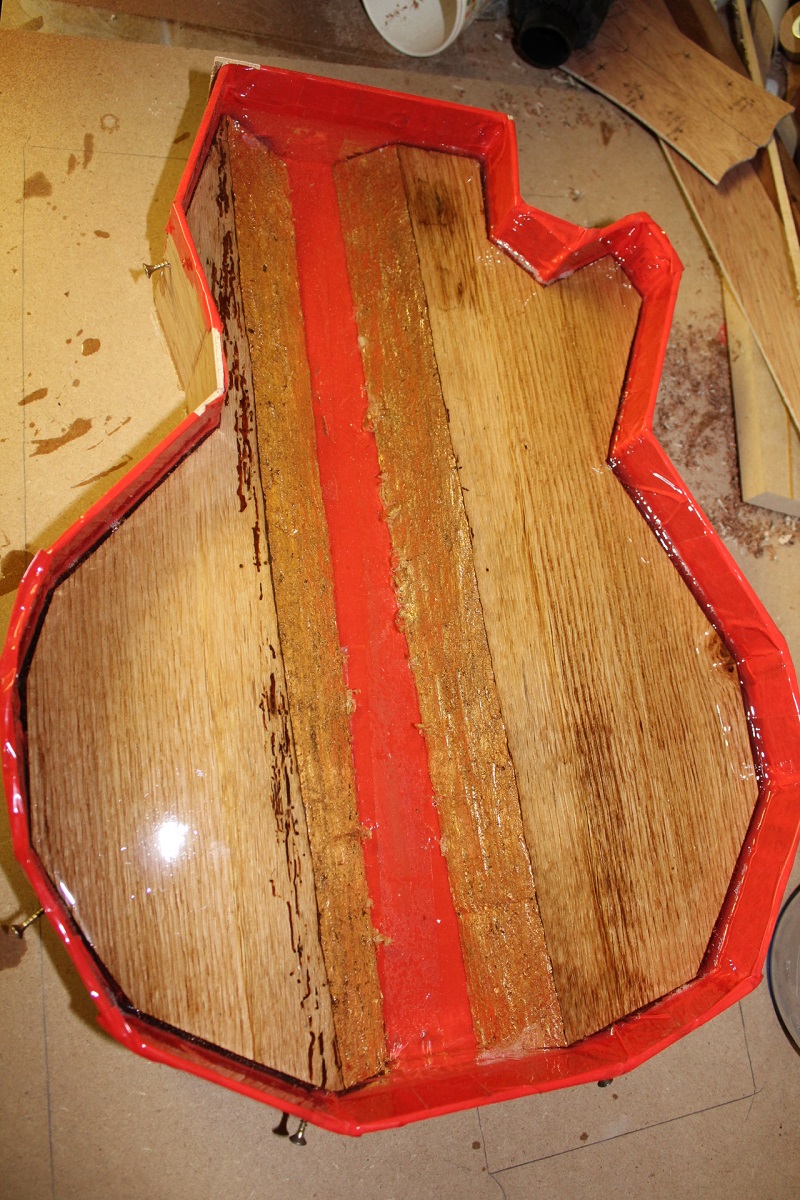 The mould is lined with plastic tape to ensure there are not any leaks and also to make it easy to separate from the guitar body
