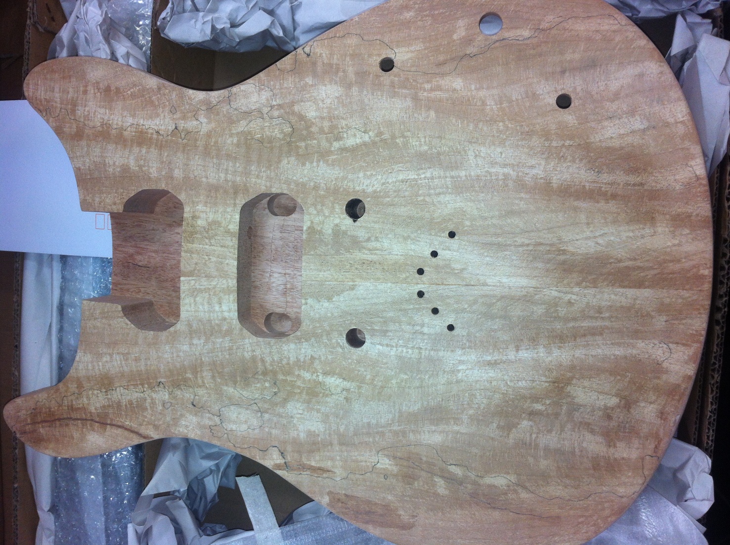 this is a build from 2013 but it's still valid, a PRS-1S with spalted maple veneer, you can even see the glue spots on the raw body out of the box the darker areas.