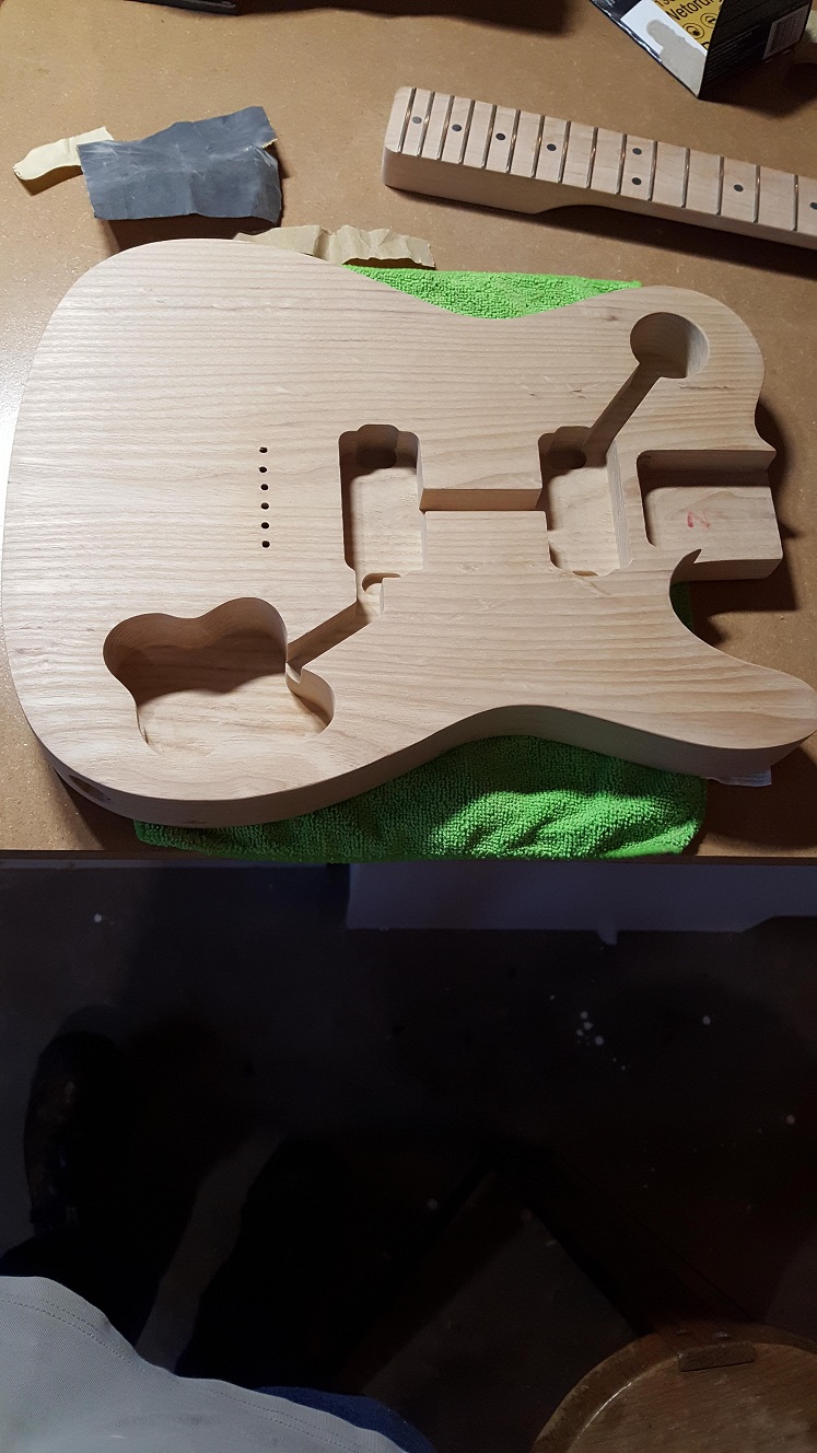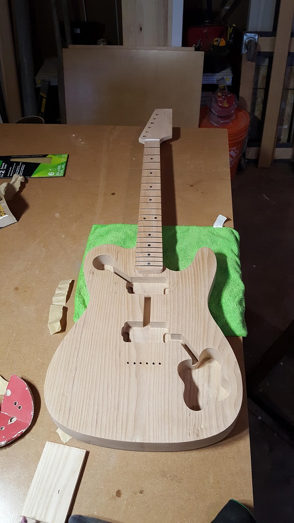 It took longer then I had anticipated, but I was finally able to get started on my guitar kit today. I had previously done a mock build to ensure everything was included, so today I worked on doing some initial sanding, and getting the neck to fit into the body. It took a little more work then I had hoped to sand the neck pocket so the neck would fit in, but I am happy with how it fits, and I think it has a good fit. Aside from fitting the neck, I started sanding the body of the guitar, I started with a 180 grit, and after that, I used a 320 grit. I am planning to do some more sanding with higher grit, the next time I do work on the guitar.