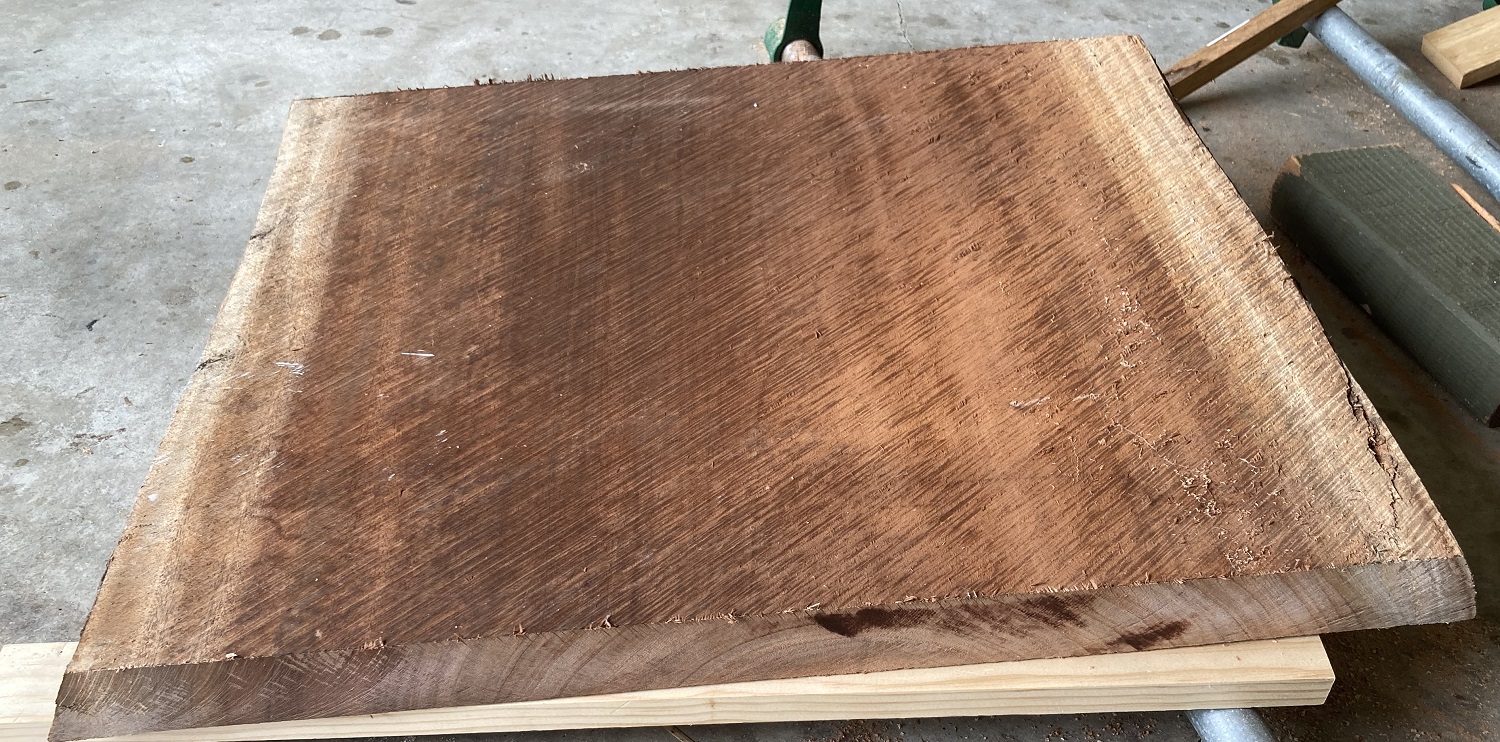I purchased, at a very good price, this lump of Queensland Mahogany (Red Mahogany, Red Messmate – Thanks to Cliff Rogers for identifying it). It was originally to be a live edge tabletop but finally my wife agreed we didn’t have the room. It took two blokes to lift it.
