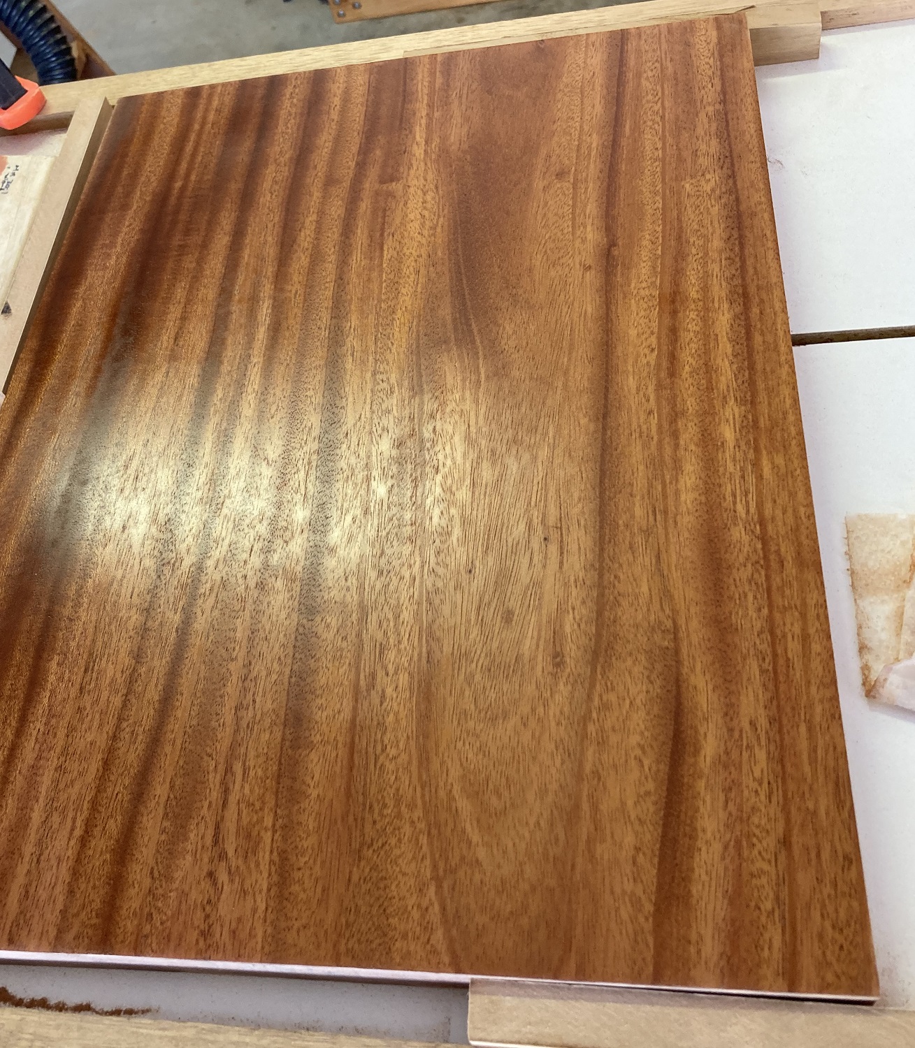 There was bit of twist in the timber, so I made some winding sticks on advice from the forum. With careful sanding, measuring thickness and the winding stick I finished with a flat plank about 34mm thick.