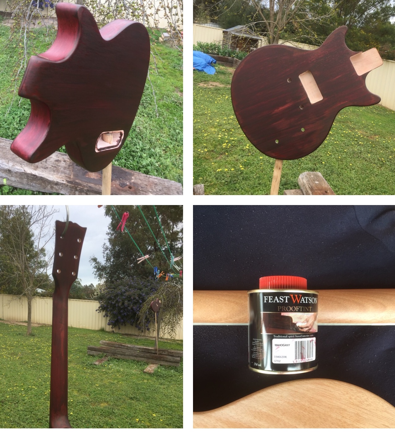I sanded the second coat of sealer this morning using 400, then 600 grade paper. Felt super smooth, so thought I’d give it a coat of mahogany stain. I did a few tests on some scrap wood a few days ago and it came up great. I was too heavy handed with the stain today, applying it with a soft rag. The sides of the body look OK, but the back and front look like shite..😩