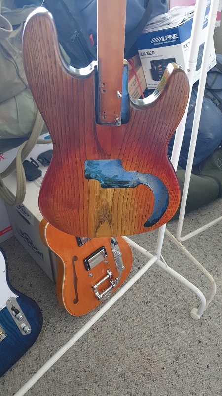 Thanks WAZKELLY for the Tru Oil brush hint. This new build is coming along great with two coats of Tru Oil on it. I am trying for a yellow, orange, red, brown Dragons Breath Fade......a three letter company has this on some of the wonderful carved top guitars.