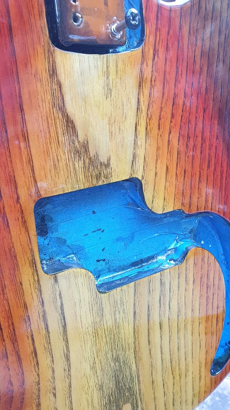 I did not do all the sanding he did during the staining phase.....as my P Bass is a solid lump of Ash. I sanded to 180grit...ebony timbermate, then sanded 240, 320 and 400. Stains on at 400 grit. No grain raising at all. Leave over night....no sand back. Then started brushing on the Tru-Oil. Now at 3 coats. I think that is enough and I will let it hang now for 7 days and then start the Polyurethane.....probably 3 lots of Poly...wet sand 600, 800 and/or 1200 if I do 4 lots. Then 10 to 14 days hanging and wet sand to 2000 and then cutting compound, polish, wax.