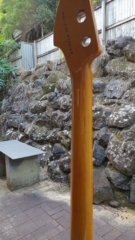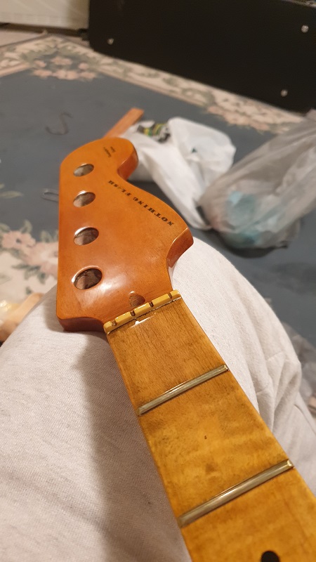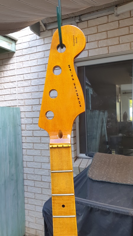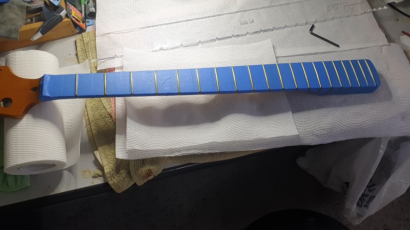 The body and neck are done as far as poly etc goes. Taped up the neck...got it flat....then levelled the frets...crowned them...rounded the ends over then smoothed with 400 grit 600 800 steel wool and autosol. Super smooth, round ends and polished and shiny.