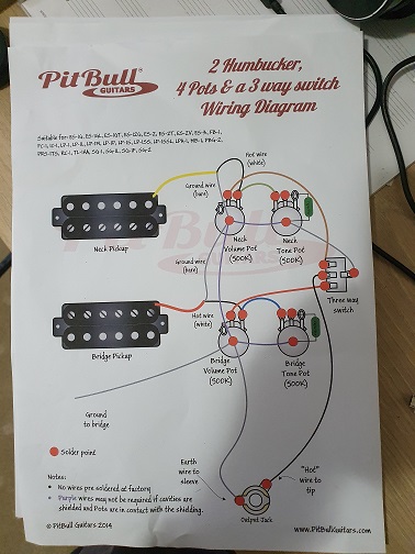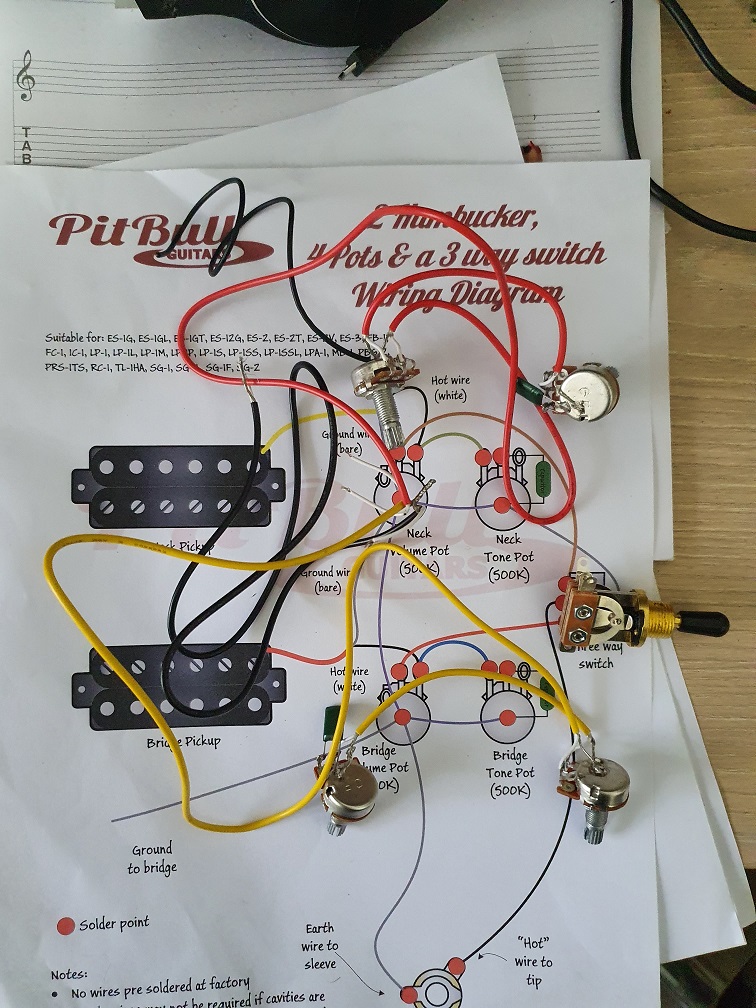 Not ready to do the wiring yet and between coats of Tru Oil. I'm ok with the wiring but looking at the wiring diagram for my Guitar , a hollow body AES-1 and comparing it with the wiring kit supplied with my guitar kit, well i'm lost to be truthful. tried to download a couple of photos but so far unsuccessful. My kit has two humbuckers , 4 pots and a 3 way switch. whats really confusing is three wires,( red,white black), have their bare wire soldered together already