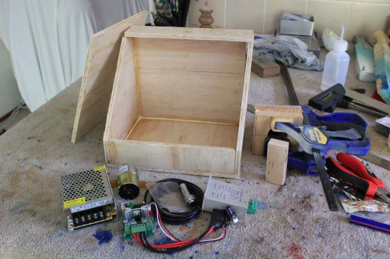 Anyway, today I (finally) got in and started to build an enclosure. My base dimensions look good, (i made sure i could accomodate the power supply and the controller easily on the floor of the enclosure) but the height looks way off. It looks way too top heavy to me - the way it is now it will shake itself to pieces when the motor gets going. I reckon I'll take it down by half before I put the rest together. I've built a motor holder as Gav suggested (two pieces of oak with a hole through the center) and am just waiting for the glue to dry before adding the adjustment bolts and installing it on the inside wall.
