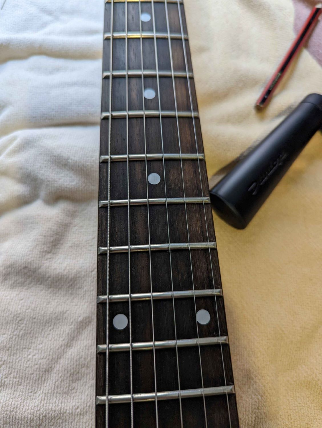 When your board looks this dry, you can't really over-do it with the lemon oil. I suggest keep oiling it, every single time you change your guitar strings. I think on my jazzmaster, I followed that process for 3 years before the board was finally at the state where I could move to oiling annually.
