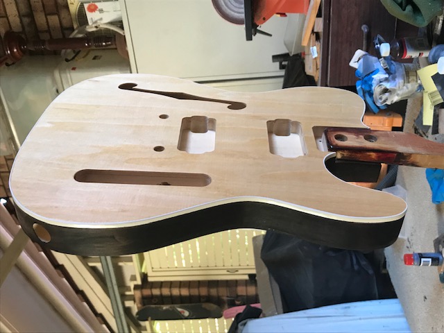 4 coats of tru-oil to the maple fret board and top of the body. (the last picture was after the first coat)
