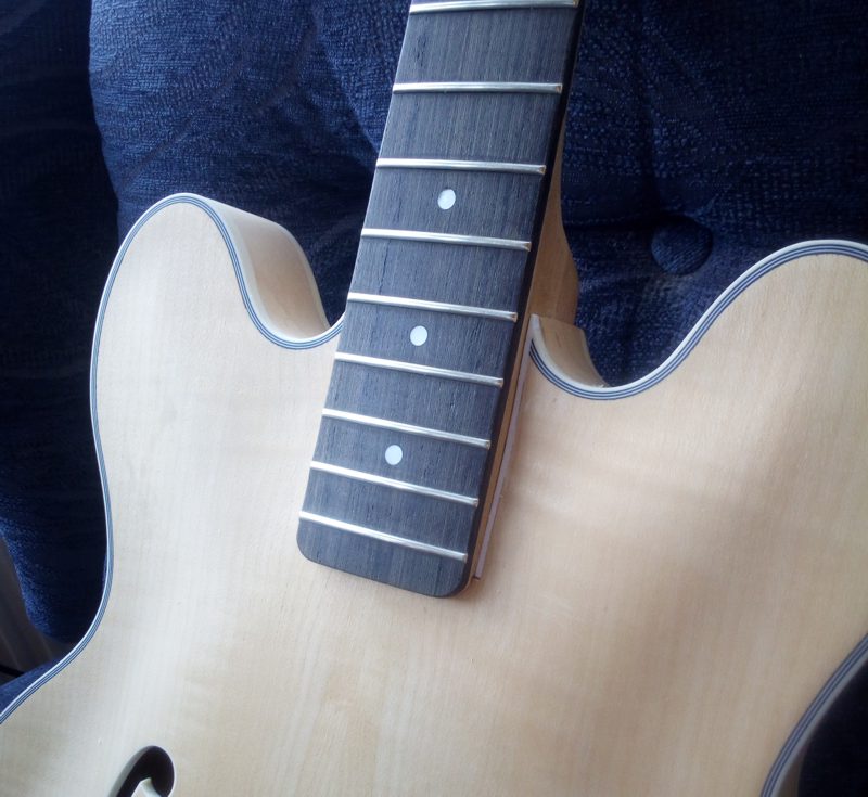 Apparently the neck pocket wasn't quite as accurate as one might like, so he had shimmed it with maple veneer so the neck ran down the centreline, but this left the end of the maple shims exposed, which looked worse than one might hope. So to disguise this I first thought of a strip of maple each side, but the piece of maple I had didn't match the body at all. Binding and purfling right round the neck pocket might have been best, but I was unable to duplicate the purfling so I just put in some 2mm white plastic I had. The ends should probably have curved round the pocket, but i wasn't too confident about cutting a neat curve by hand, and it will be fine from five feet away...