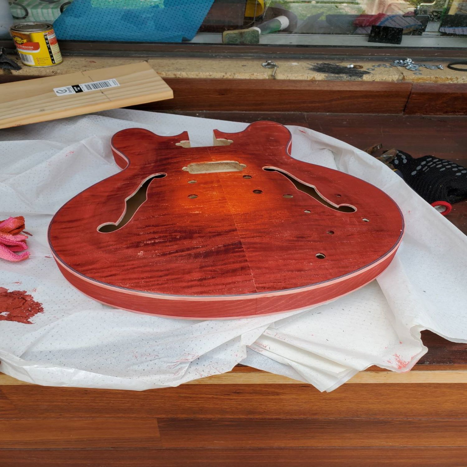 I stained my hollow body pitbull guitar - which I lightly sanded with 1200 before