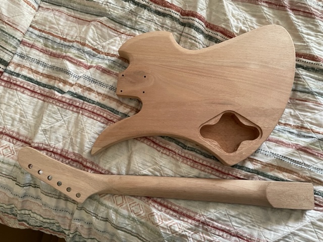 I managed to purchase the Custom MBM-1 from the specials last week. Mahogany body and neck with a Spalted Maple veneer, reverse hockey stick headstock, and no fret markers. The kit arrived with no hardware - but Adam has since delivered a black hardware pack (thankyou).