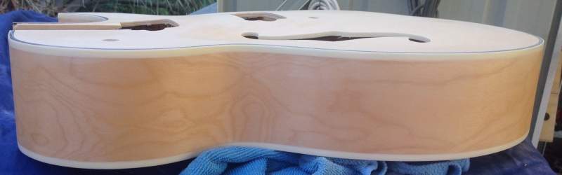 Well, I had pretty well resolved not to build anymore guitars and stick to valve amps but, after seeing the ES-3 on such an amazing Sunday Special price a few months ago, I couldn't help myself. In fact, it was my wife who said 'that's cheap, you should get it'. And being a devoted husband, I did as I was told. Anyway, the humidity has finally settled in Mackay so now it's time to build. At first look all seemed sweet apart from a couple of small depressed lines across the fretboard, and a neck heel that didn't quite fit squarely into the cavity. So, after some gentle sanding (with 180 grit and a rasp!), that problem seems to be OK now. I also did some wet ragging and found that there were no glue issues around the binding - excellent. I've given the whole thing a quick 400 sanding and already I'm impressed. Roll on next weekend.