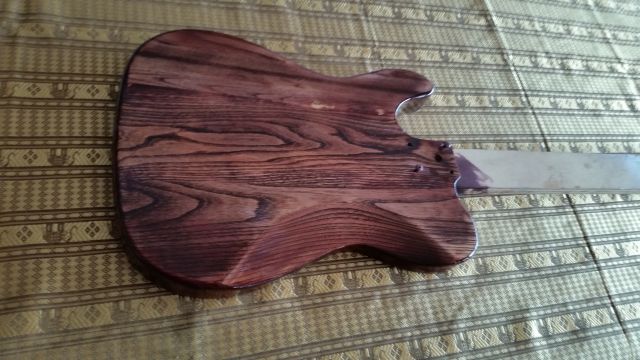 Many coats of Wattyl Dark Mahogany stain, then wet sanded with 1000 grit on the front and back only leaving the sides dark red/brown, the face of the headstock is getting similar treatment.