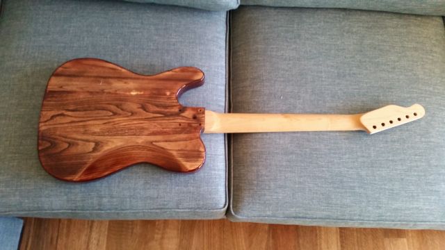 Here's a front and rear pic with the first coat of stain, it's making the grain pop nicely but unfortunately also highlights the fact that there's more than one piece of wood and it's not book matched.