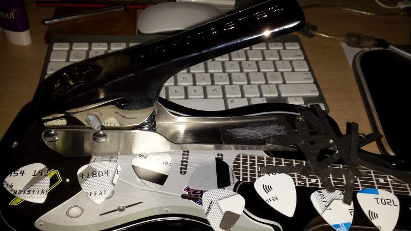 It is a guitar pick maker, there are a lot of different ones around but mine is a "PICKMASTER'. It's good to have kids that know what is needed. Now will never need to buy another pick, although I might run out of credit cards, as that is what I used to make a few out of. At first I thought they may have been to flexible but they are just about right. If you are careful one card will make 5 picks but four if you dont line them up.