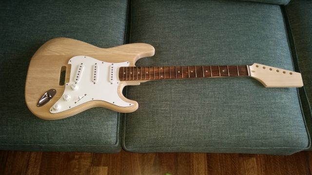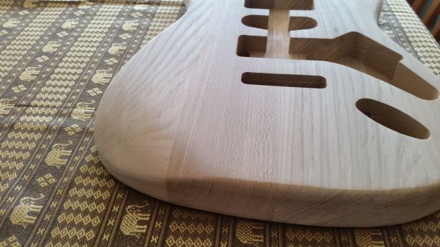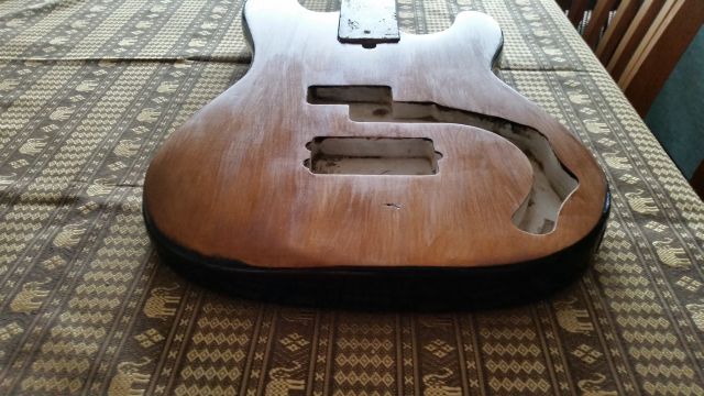 Hopefully I'll have more luck with the Sikens Ebony finish than I had with the FW Black Japan the body will be a translucent finish and hopefully the grain will really pop, neck will be done in citrus oil and the headstock shape will be either 50th Anniversary or Ibanez ( the jury is still out ). Hardware will be stock with the standard white 3 ply guard and if I can find the Seymour Duncans that my grand kids have put away for me they will replace the stock items