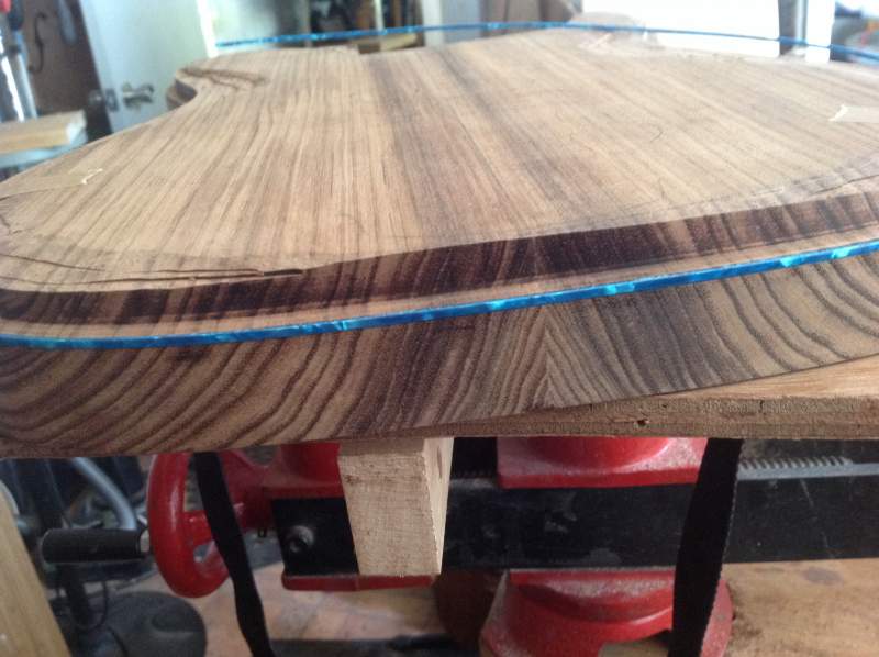 Rout it out and add Iroko binding, blue perloid purfling strip and finally red pearloid bindings.