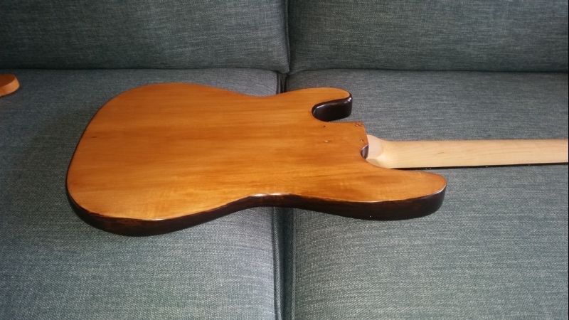The current and final body finish is Black Japan on the edges, maple gloss stain and then clear with a heap of sanding and carnauba wax, the neck simply has citrus oil, wax and polish