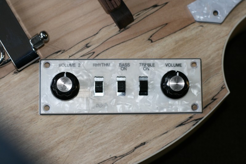 As for the stock hardware, the pickup surrounds and control plate are just not good enough to use. Have a look at the close-up of the control plate. Those non-square holes with the rounded out corners? The switches that are mounted so that they are in the centre of the slot when in the 'down' position but at the top of the slot in the 'up' position? The white stripes are crooked on the knobs and knobs have casting flash on them. Rejected.